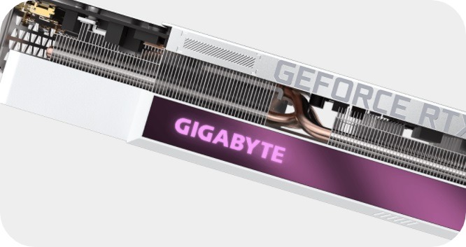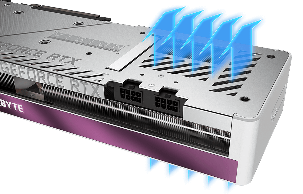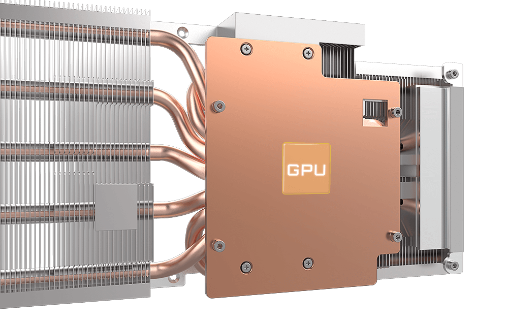 Dzięki bezpośredniemu kontaktowi z procesorem graficznym i pamięcią VRAM duża miedziana płyta łączy kompozytowe rurki cieplne, aby skutecznie przenosić ciepło generowane z wewnętrznych rdzeni do radiatora.