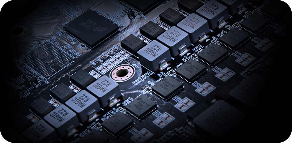 Karta graficzna wykorzystuje lepszą konstrukcję fazy zasilania, aby umożliwić tranzystorowi MOSFET działanie w niższej temperaturze, ochronę przed przegrzaniem i równoważenie obciążenia dla każdego tranzystora MOSFET, a także certyfikowane dławiki i kondensatory Ultra Durable, aby zapewnić doskonałą wydajność i dłuższą żywotność systemu.