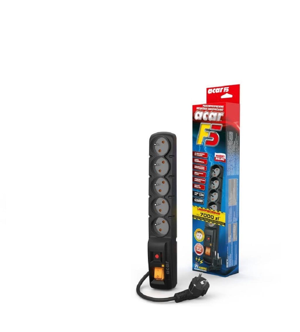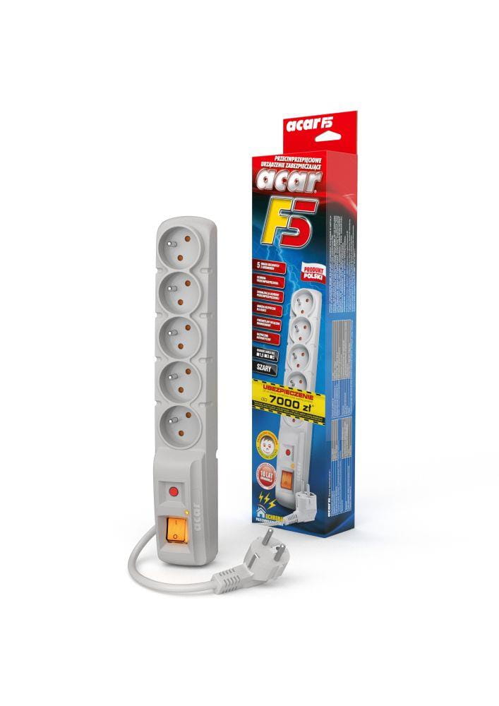 Listwa zasilająca Acar F5 Listwa zasilająca Acar F5 to zabezpieczenie przeciwprzepięciowe pięciu urządzeń. Listwa została wyposażona w podświetlany wyłącznik, wygodny automatyczny bezpiecznik, szybkie warystory, a także pozwala na cztery możliwe kierunki ułożenia sznura sieciowego. Dodatkowo estetyczny wygląd i konstrukcja listwy, która jest wykonana z wysokiej jakości niepalnego tworzywa sprawiają, że jest to najbardziej trafny wybór do biura i domu.
